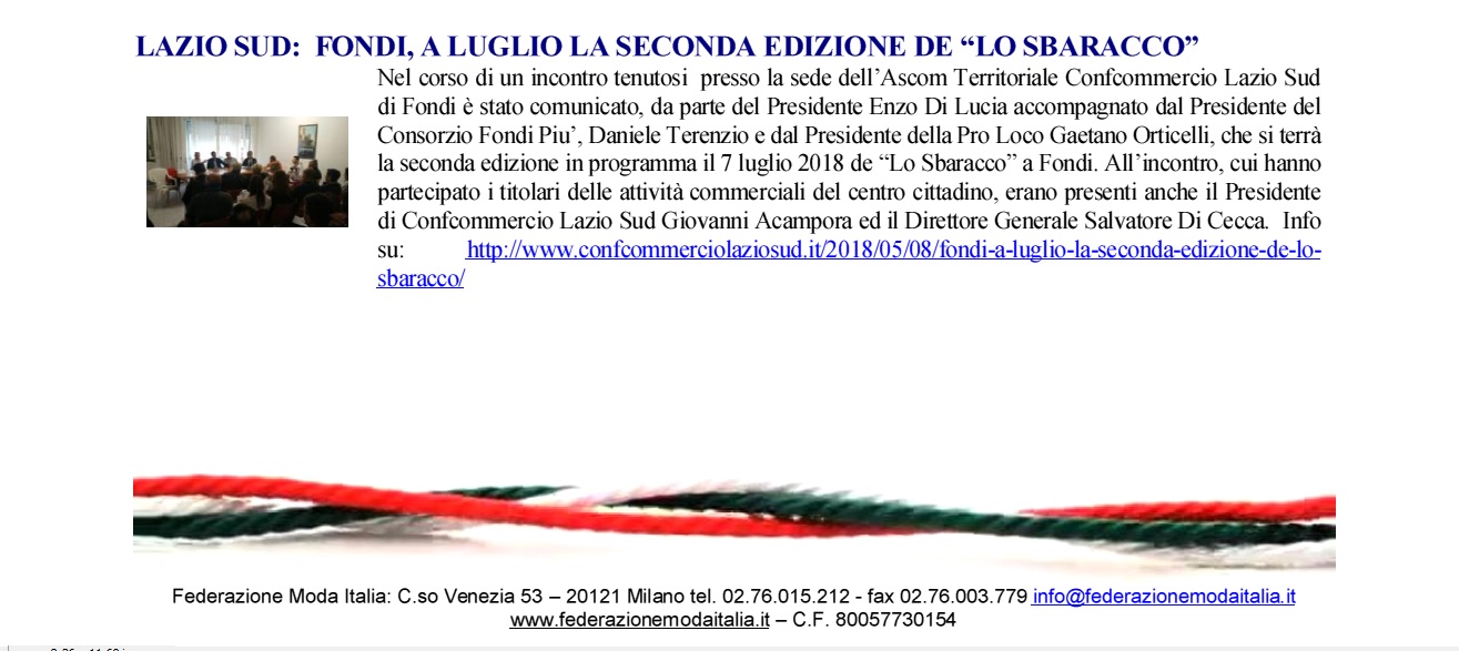 FEDERMODA ITALIA annuncia il ritorno a Fondi de "Lo Sbaracco". La seconda edizione è in programma per il 7 luglio. Tante le novità di questa edizione 2018. Lunedì scorso la prima riunione presso l'Ascom #Confcommercio Lazio Sud con i #commercianti del centro città.